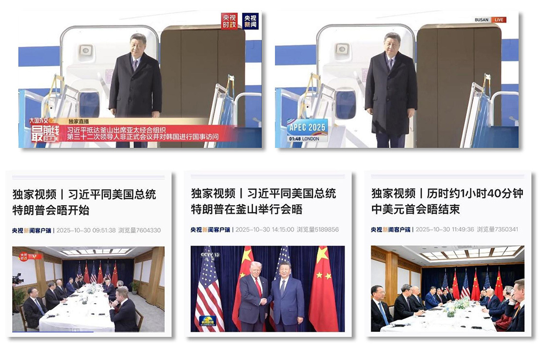 新媒体产品引发现象级传播!时政微纪录“习主席的韩国APEC时间”推出第一集《中美元首釜山会晤》,展现习主席把握大势、驾驭大局,为改善发展中美关系确定基调、指明方向。视频产品《中美元首会晤前 美国总统特朗普抵达会晤现场》《中美元首会晤结束后 特朗普总统送习近平主席上车》,精准捕捉细节画面,以生动的镜头语言传递美方对双方元首会晤的高度重视,彰显习近平主席的崇高国际威望。系列产品获全网置顶推荐,央视新闻发起的#中美元首釜山会晤#等9个微博话题总阅读量超5亿。