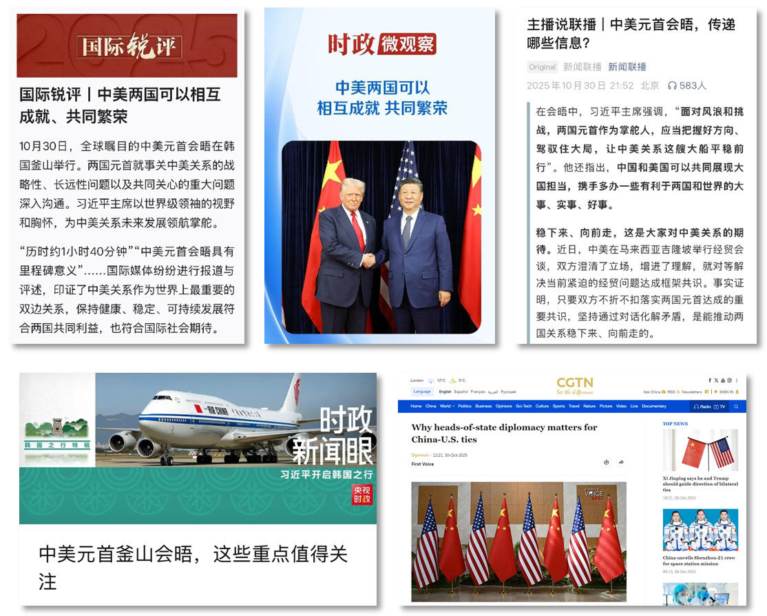 “大国外交最前线”“国际锐评”“时政新闻眼”“时政微观察”“主播说联播”“先声夺人”“天下观”等品牌专栏立体联动,推出《中美元首会晤开场白,传递哪些重磅信息?》《中美元首釜山会晤,这些重点值得关注》《元首外交掌舵定向》《中美元首会晤 迈向共赢未来》等系列评论,多角度解读习近平主席重要讲话和两国元首会晤为动荡不安的世界注入宝贵的稳定性与确定性。