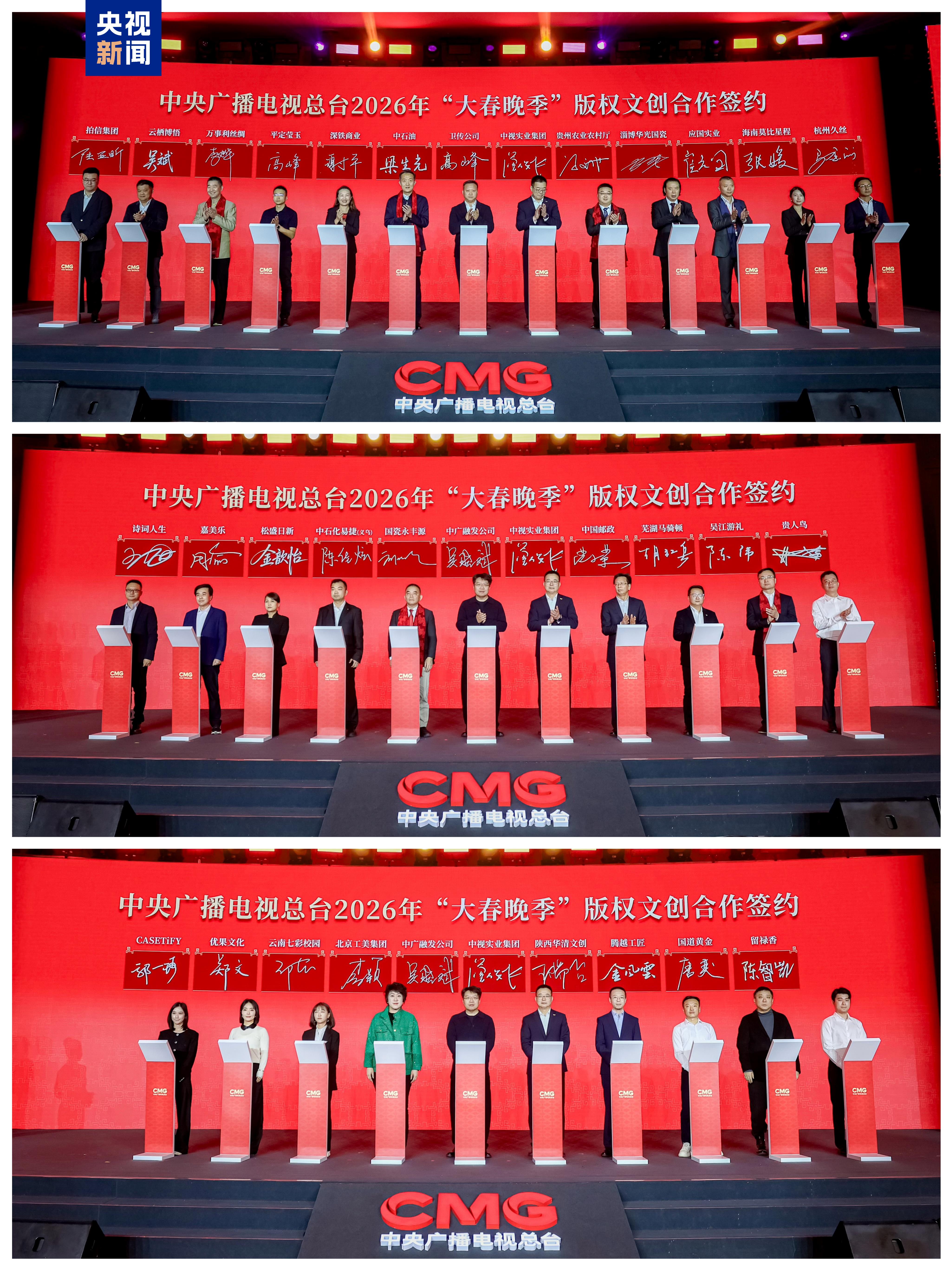 活动上,总台相关下属公司与中石油、中国邮政、北京工美、贵州省农业农村厅、深铁商业、国瓷永丰源、淄博华光国瓷、平定莹玉、应国实业、万事利丝绸、海南莫比星程、云栖博悟、西子丝坊、拍信集团、贵人鸟、中石化易捷义乌分公司、吴江游礼、芜湖马骑顿、松盛日新、嘉美乐、诗词人生、陕西华清文创、云南七彩校园、腾越工匠、优果文化、国道黄金、壳子特玩、茂名正当时等签署了总台2026年“大春晚季”版权文创合作协议,共同推动总台春晚IP的多维开发。