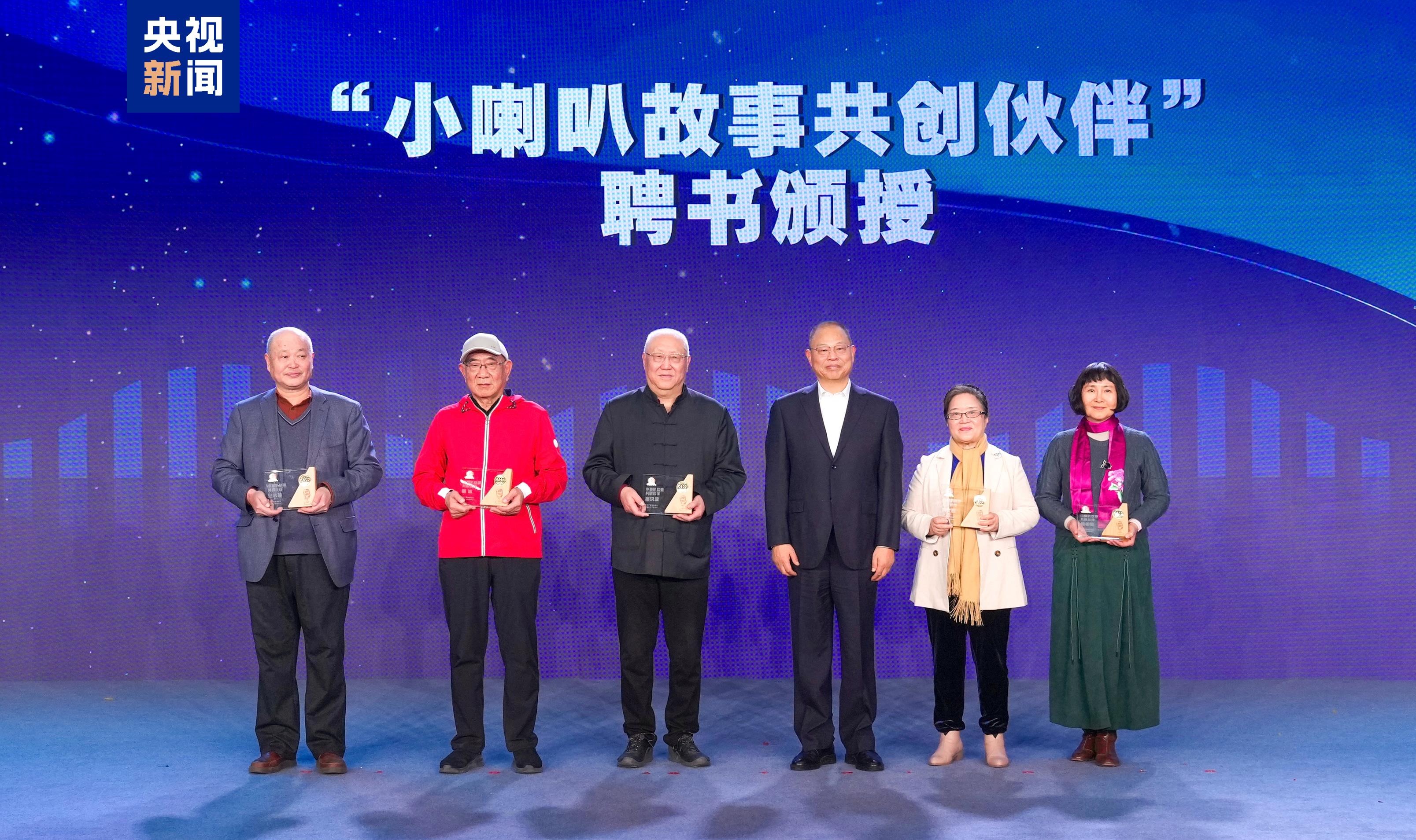△薛继军为儿童文学作家代表高洪波、葛冰、秦文君、安武林、保冬妮等颁发“小喇叭故事共创伙伴”聘书