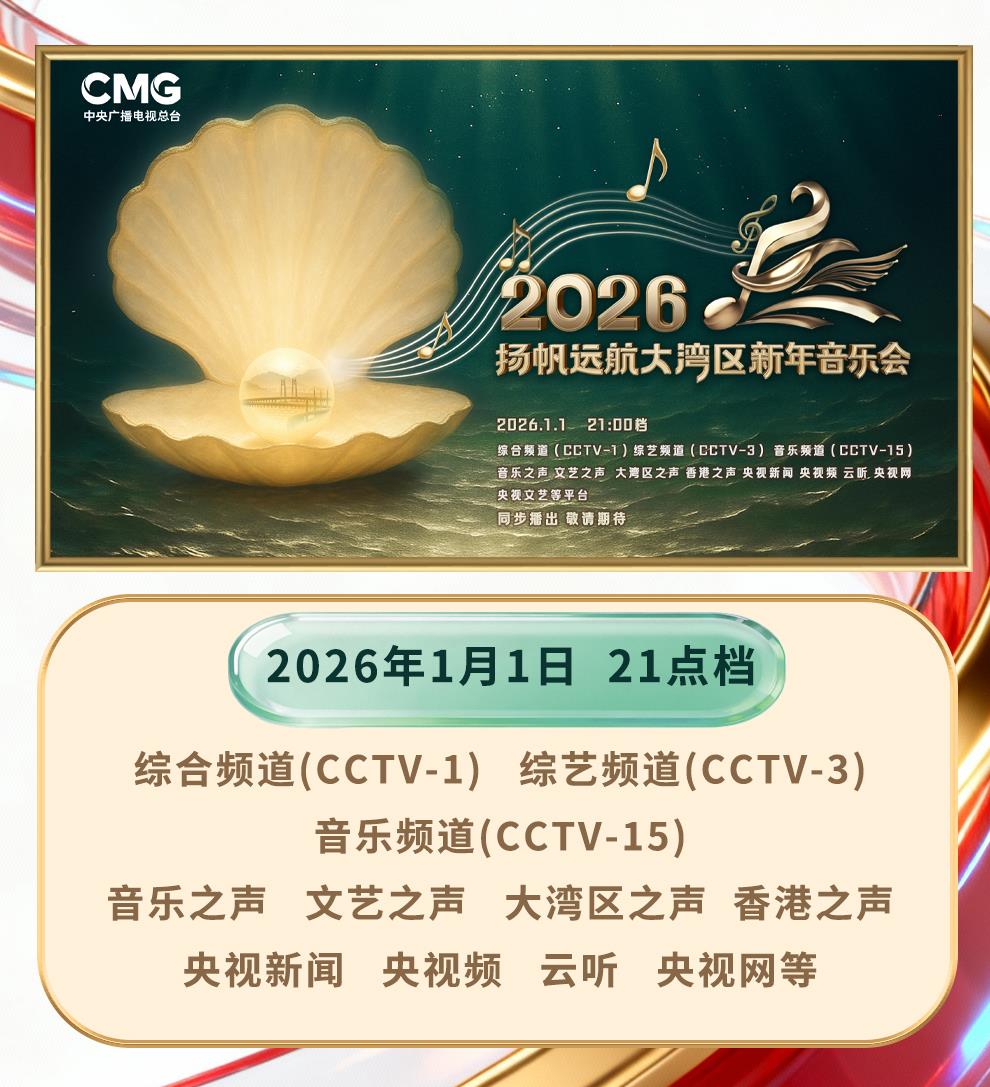 跟随《扬帆远航大湾区——2026新年音乐会》,以“海”为着眼点,以“家”为情感线,以“路”为行动线,开启一场临海漫游的音乐之旅。四个乐章串联湾区城市依海而生的家园情怀,“海浪”作为视觉符号被融入湾区夜色,塑造出全新的舞台景观。来,一起“乘风破浪,扬帆远航”!