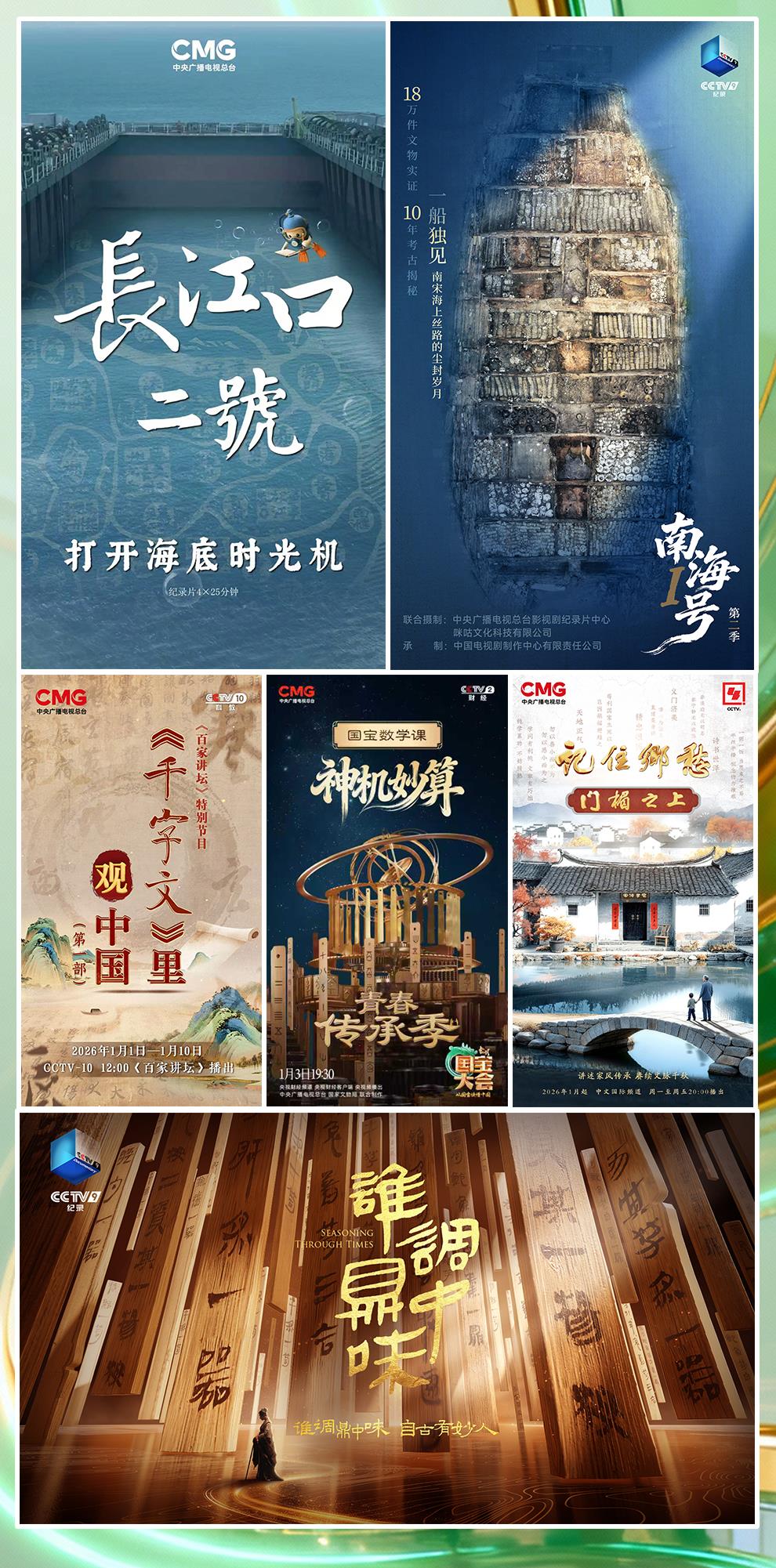 幻方铁板中隐藏怎样的数字排序密码?《寻找国宝传颂人——2025中国国宝大会》(青春传承季)带您领略“神机妙算”的中华数学之美。纪录片《长江口二号:打开海底时光机》全程独家记录世界首个古船整体迁移、文物保护、考古发掘与博物馆建设展示同步实施工程。纪录片《南海I号(第二季)》依托最新考古发现与研究成果,让您走进海上丝绸之路贸易的历史场景,触摸中国与世界交往的文化印记。纪录片《谁调鼎中味》以马王堆汉墓文物为线索,展现汉代饮食文化。系列节目《<千字文>里观中国》,带您在《千字文》中探秘中国汉字的神奇。《记住乡愁》系列节目“门楣之上”以门楣为文化符号,挖掘匾额、楹联与家谱中所承载的家规祖训,彰显中华优秀传统文化的时代价值。
