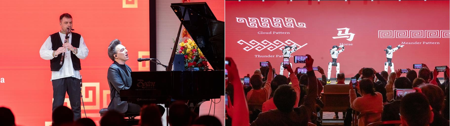活动现场,曾登上总台2023年春晚舞台的塞尔维亚国宝级歌手斯洛博丹·特古拉,将塞尔维亚民族乐器与中国民乐巧妙融合,演绎中国经典曲目《茉莉花》。来自中国的人形机器人进行舞蹈表演,生动展现中国智能科技创新成果。