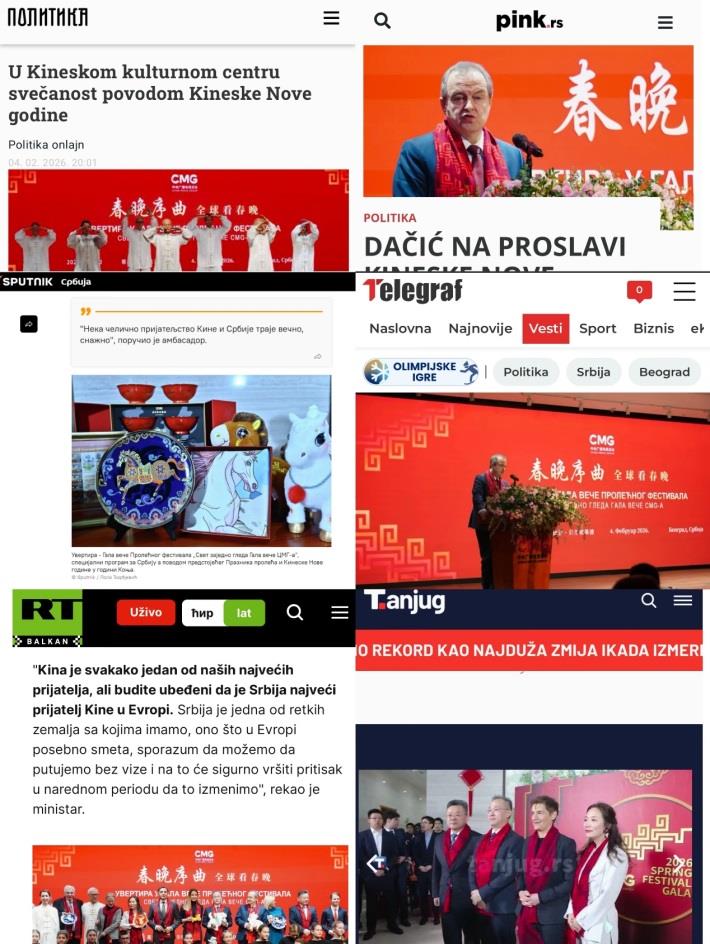 截至目前,“春晚序曲 全球看春晚”塞尔维亚专场活动相关报道被塞尔维亚广播电视台、塞尔维亚《政治报》、南通社、欧洲新闻台、今日俄罗斯电视台、俄罗斯卫星通讯社等欧洲多国主流媒体转载转引。