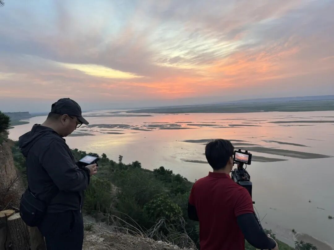 △张宁与总摄影胡彬在陕西韩城拍摄“八路军东渡黄河出师抗日”段落