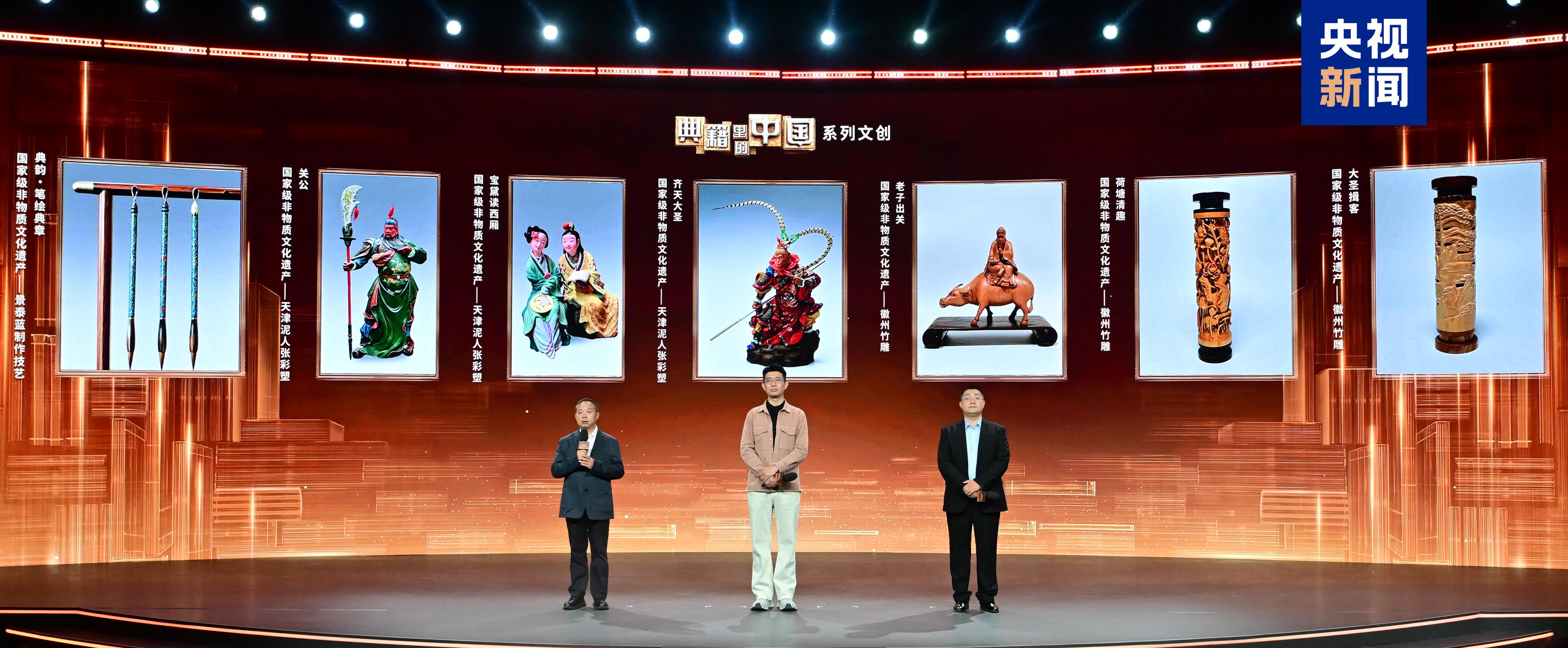 △北京工艺美术大师、国家级非物质文化遗产景泰蓝制作技艺代表性传承人张旭,国家级非物质文化遗产天津泥人张彩塑代表性传承人赵阳,黄山市徽州雕刻博物馆研究员王超现场推介《典籍里的中国》系列文创产品
