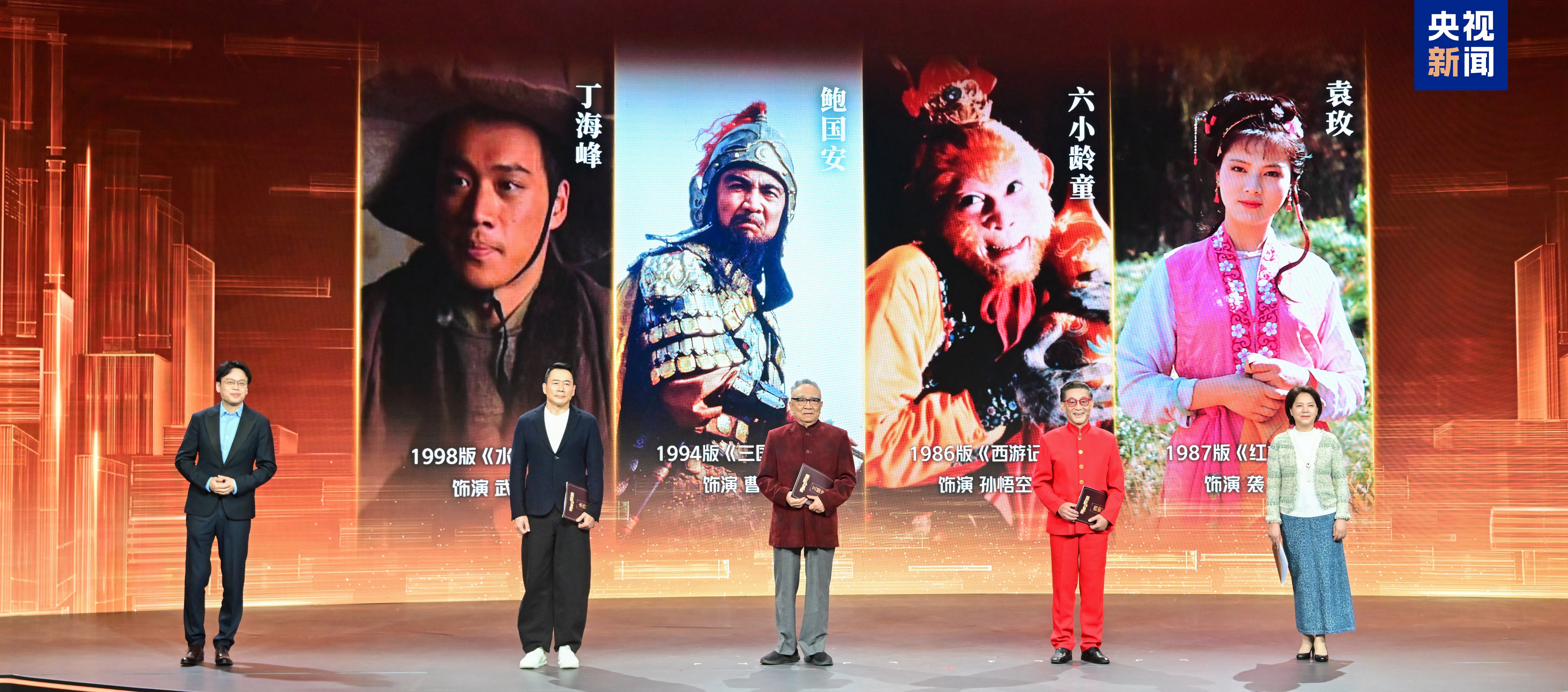 △“四大名著”改编影视作品中“曹操”“孙悟空”“武松”“袭人”的饰演者鲍国安、章金莱(六小龄童)、丁海峰、袁玫,中国人民大学国学院教授、博士生导师谷曙光通过“典读会”的方式向大家推介典籍书目