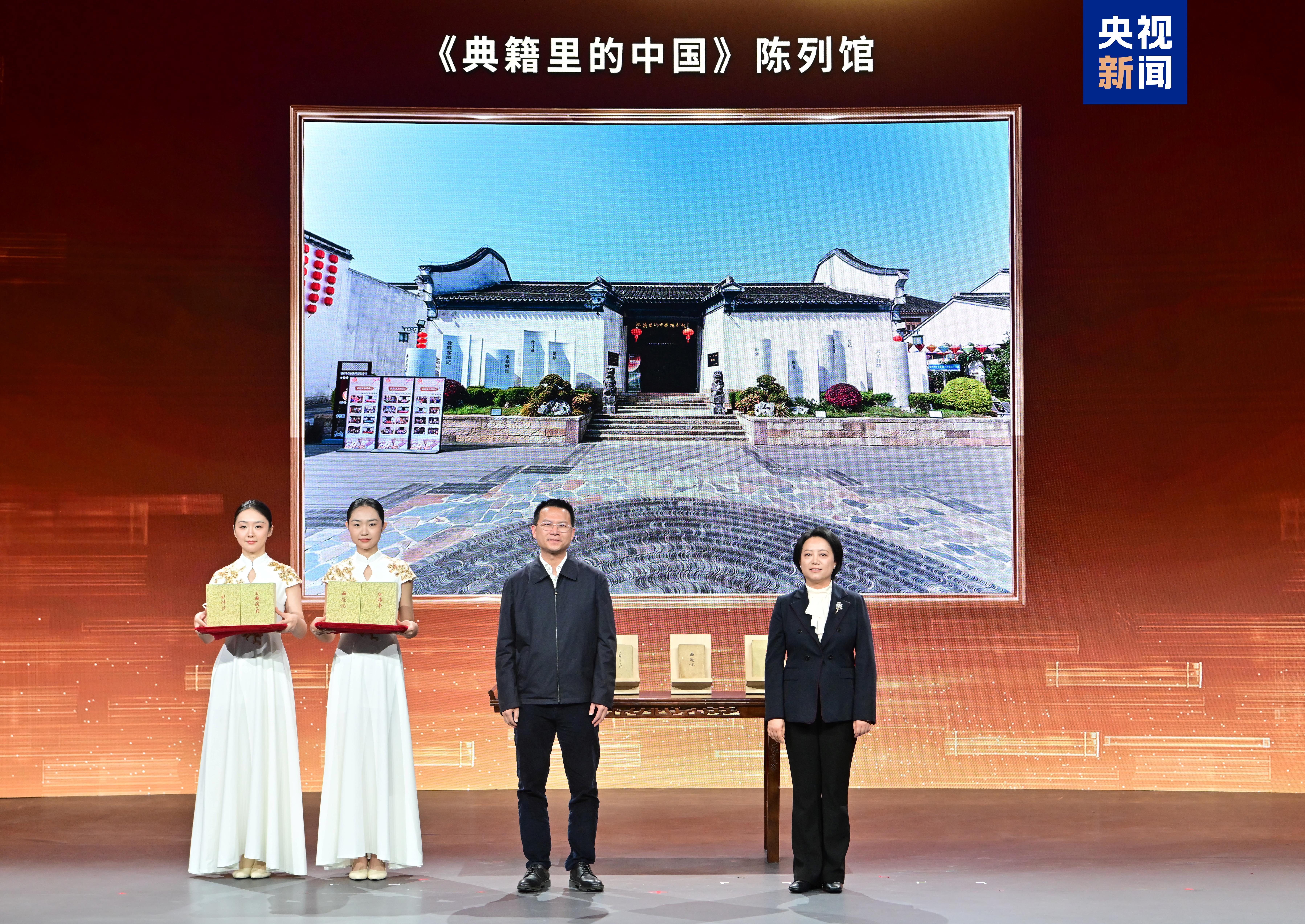 △人民文学出版社总编辑吴良柱向《典籍里的中国》陈列馆赠送一批四大名著初版(纪念版)图书,浙江省湖州市吴兴区委常委、宣传部部长厉云燕代表陈列馆接受捐赠