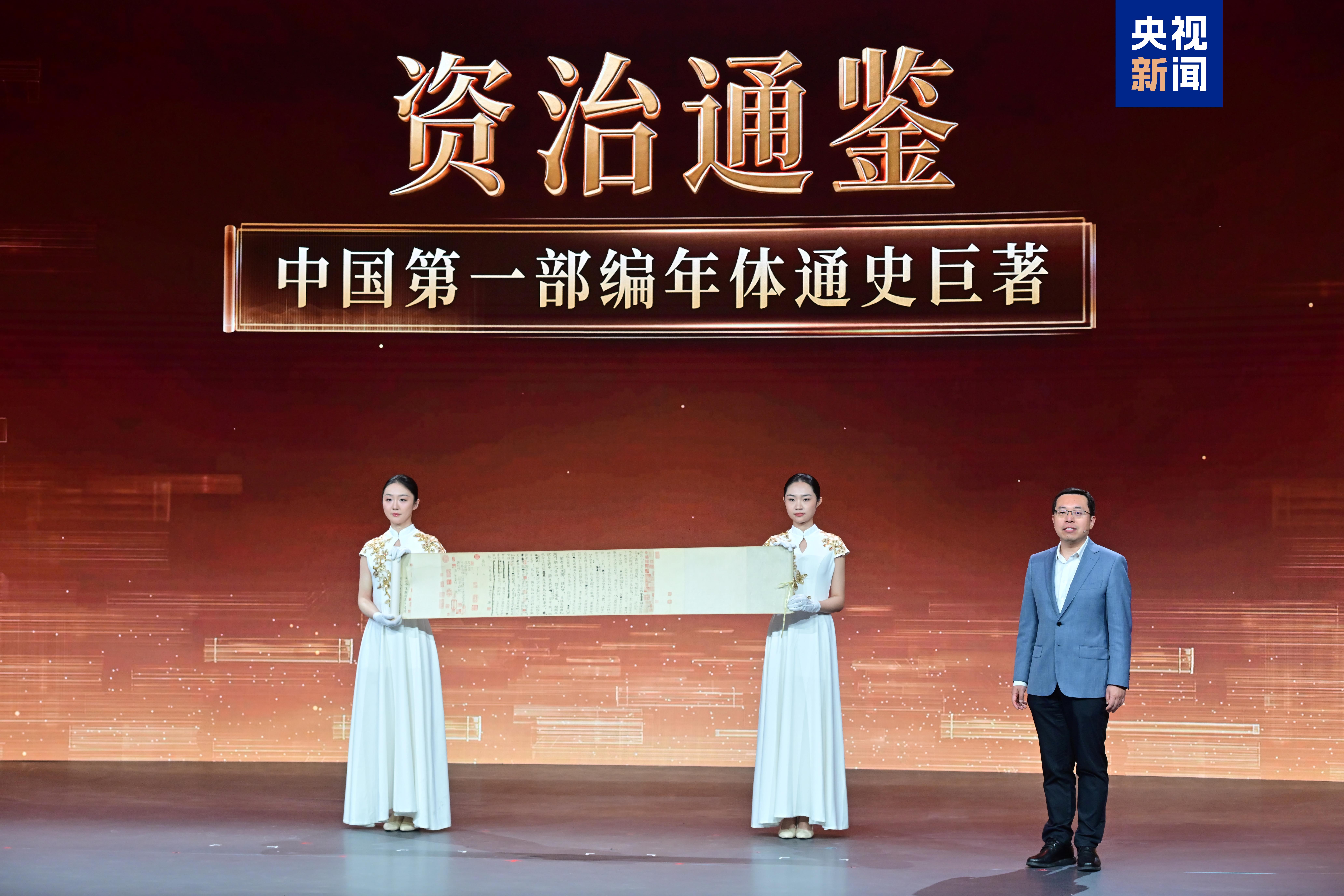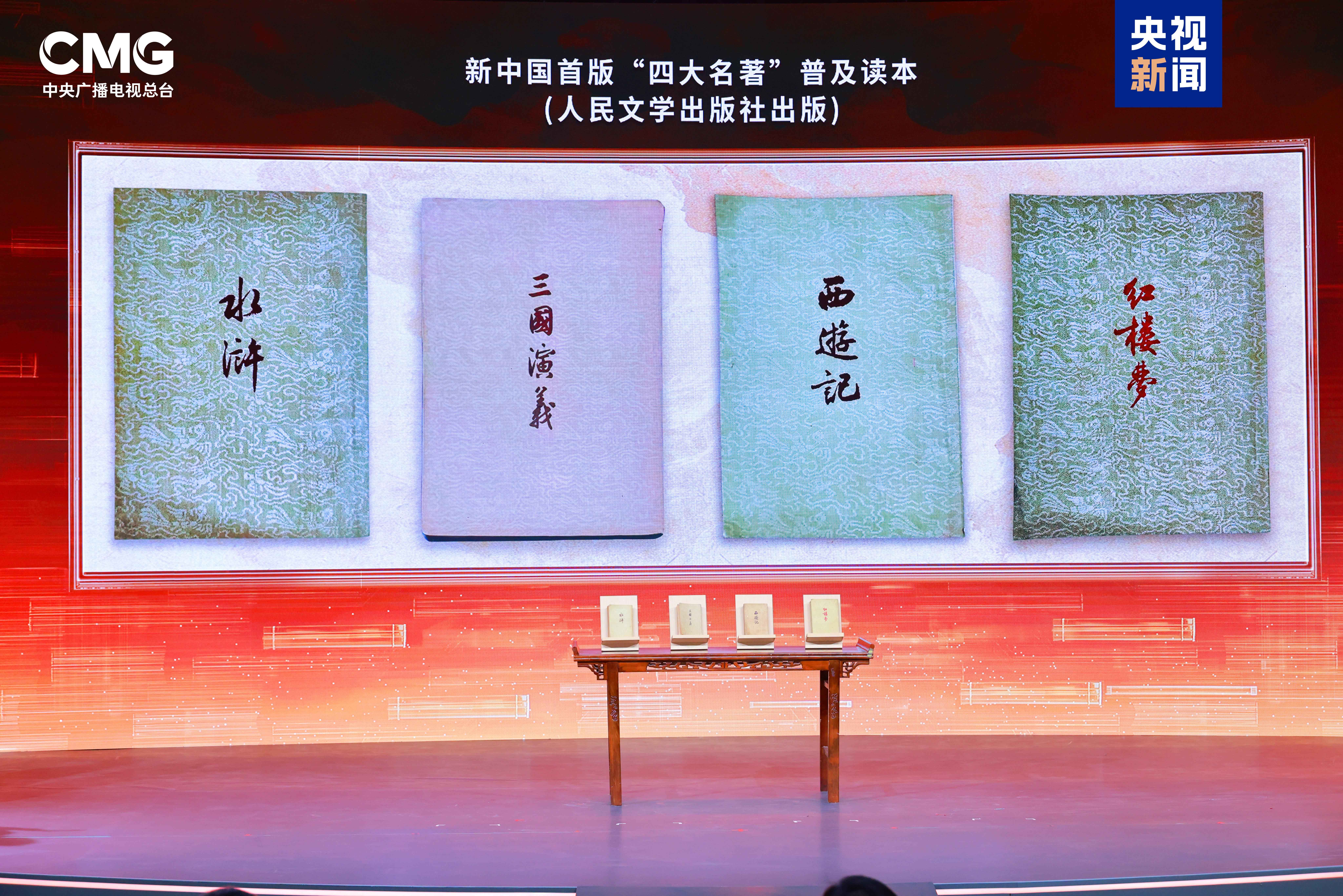 活动现场展示了中国国家图书馆“镇馆之宝”、北宋司马光编纂的《资治通鉴》存世唯一手书原稿的复刻件,以及新中国成立后由人民文学出版社出版的首版“四大名著”普及读本原件。