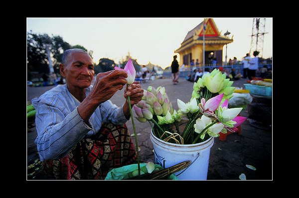 在寺庙前,这位老妇人正在一丝不苟地把莲花的花瓣弄成半开放的形状,以供给信徒们敬佛。(摄影:CCTV.com国家地理频道网友【方方正正】)