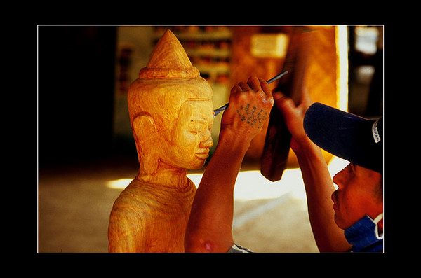 一个手上带刺青的匠人在雕刻木佛像。(摄影:CCTV.com国家地理频道网友【方方正正】)